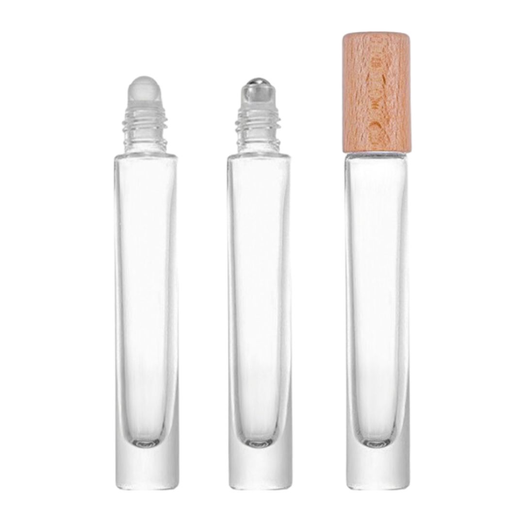 0.33 oz, 0.5oz Clear Glass Roll-On Bottle with Wooden Lid — a compact solution for your liquid dispensing needs. Ideal for essential oils, perfumes, and other liquid products.